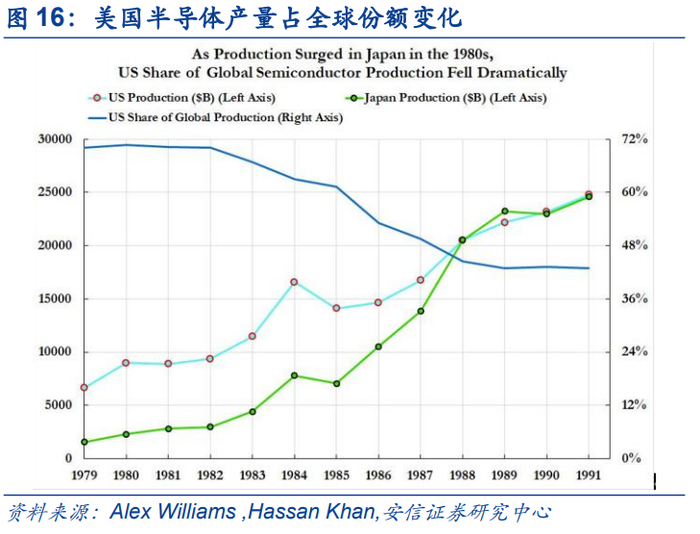 20世纪70年代,半导体由国防转向商用市场,美国半导体行业进入黄金时代。经过政府前序长期不断资金支持,到了1973年,虽然政府采购比例由于行业规模扩大以及行业发展需求与国防需求不同而不断下降,但美国企业半导体总销量已超过320万美元, 1979-1982年美国公司半导体产量占全球份额持续高达70%左右。