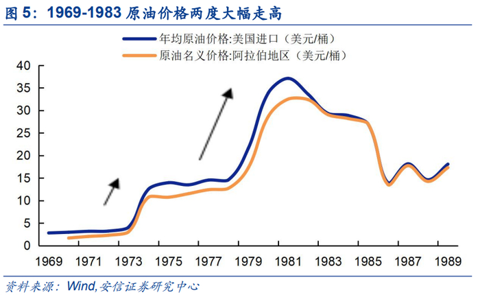 两次石油危机接踵而至,CPI能源分项上行。 1973年10月6日,埃及、叙利亚对以色列宣战,第四次中东战争爆发。10月20日,沙特阿拉伯宣布对美国实行石油禁运,第一次石油危机爆发。国际油价大幅上涨,美元作为石油国际结算的唯一货币大幅贬值,促使美国通胀快速上升,能源价格上行令美国能源CPI同比增速由1973年10月3.7%上行至1974年8月33.7%的高点。1979年伊朗爆发伊斯兰革命,而后伊朗和伊拉克爆发两伊战争,原油日产量锐减,第二次石油危机到来,1978年至1981年美国年均进口原油价格由14.57美元/桶上涨至37.1美元/桶,原油价格高涨推动通胀再度上行,1979年12月,CPI能源分项同比增速达13.3%,四季度美国CPI同比13.3%,这对于任何一个国家来说都是恶性通货膨胀水平。