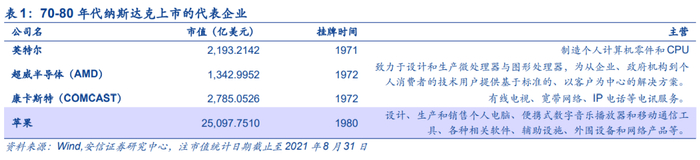 雏形初现,中小科技公司登陆纳斯达克。1971 年 2 月,纳斯达克正式启动,当时纳斯达克并不是真正的交易所,既没有挂牌标准,也没有撮合交易功能,只是一个自动报价系统,承担收集和发布股票的证券商报价的工作。纳斯达克这种只要有做市商愿意做市即可参与交易的方式,成为无法满足纽交所上市条件的科技公司的“救命稻草”,为大量中小科技公司提供了新的融资希望,日后的微处理器巨头英特尔(Intel)、超威半导体(AMD)以及大型传媒集团康卡斯特(COMCAST)正于此时申请挂盘上市。