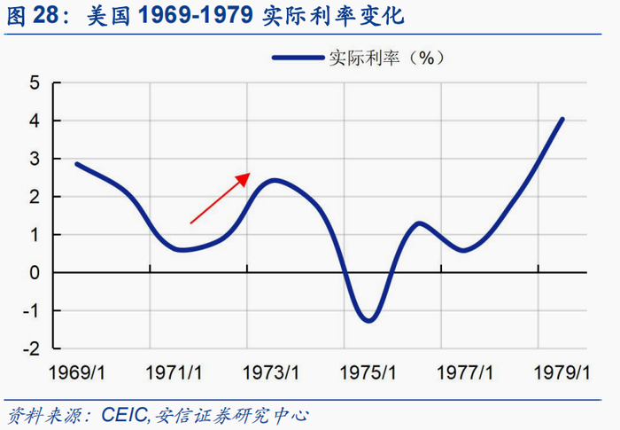 初次滞胀到来。在滞胀初现时期,美联储主席马丁(美联储第三任主席,任期为1951-1970年)在任期阶段开始尝试实施逆周期的货币政策,主动的货币政策操作开始压倒通胀预期的变化,成为实际利率决定的主导性因素。1969-1970年期间美联储紧缩货币供给,通货膨胀得以抑制,但经济初现快速下滑。这使得本就承受国际收支失衡和冷战环境下大额军费支出的美国压力倍增,私人部门投资增速大幅放缓、政府支出处在过渡期成为经济增长拖累项,甚至1971年Q2美国出现了自1893年以来的首次贸易逆差。