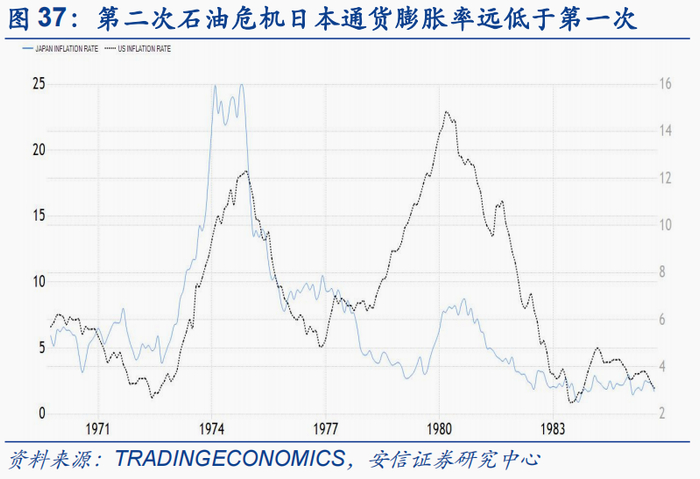 1)时间不长且后续通胀压力不高。重大的产业改革配以及时节制的货币政策,法定贴现率由1978年3月的3.5%,经历5次加息,增加至1980年3月的9%,使得日本经济具备了抵御通胀的调节能力,第二次石油危机后的日本最高CPI同比8.7%远低于美国CPI同比增长14.8%的水平。