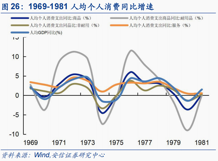 ■产业结构上,美国70年代消费升级,服务消费逐步取代商品消费,但滞胀期间个人可支配收入急剧下滑。70年代,美国消费经历由商品到服务,由耐用品到非耐用品的转换。1969年四季度服务消费占比首次超过商品消费,后续两者差距继续扩大,医疗护理分项对个人消费支出有明显拉动作用,1981年拉动比率为48%。服务消费与商品消费比重由1969年一季度0.96扩大至1981年四季度 1.26。商品结构内部,非耐用消费品占比提升,1969-1981年累计提升3个百分点,而以机动车辆和零部件为首的非耐用品震荡下行。人均角度来看,由于石油危机导致油价快速上涨,对汽车等耐用消费品需求下降,耐用品消费支出增速弹性高于非耐用品和服务支出,成为消费支出中最大的GDP拖累项。