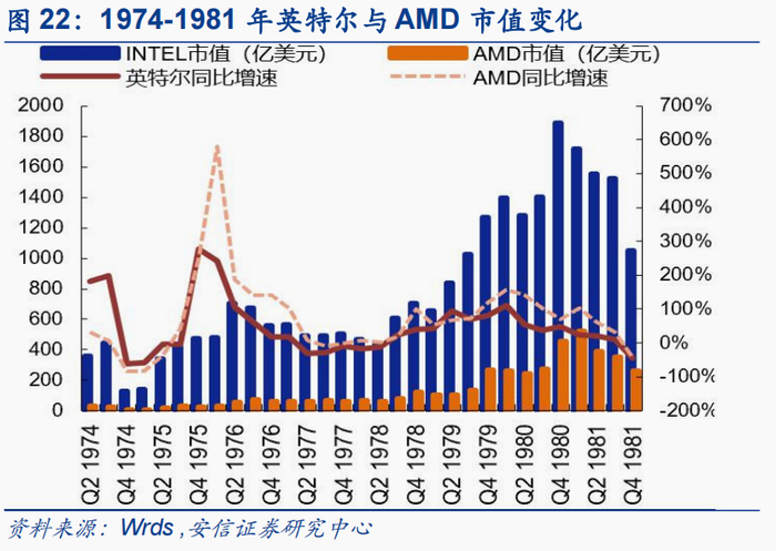 当时的超威半导体(AMD)作为英特尔的技术授权厂商,同时享受到订单需求增长的红利,1976年Q1和1979年Q4市值分别迎来小高峰,同比分别增长581%、119%。