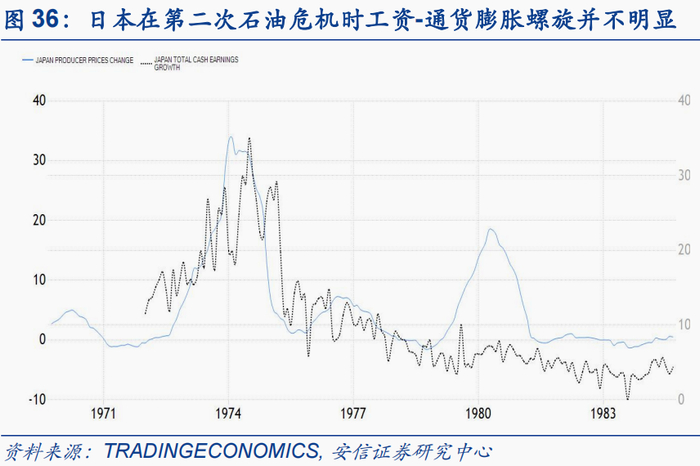 4)如果一定要对比,当下的“胀”,我们认为更接近第二次石油危机中日本的输入型通胀,从经济发展阶段和传导路径上综合判断,能源转型和产业结构升级有助于调节外部通胀风险,另外PPI向CPI传导导致“工资-通货膨胀螺旋”并不会一定发生。