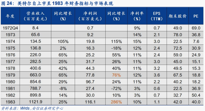 以英特尔为例,伴随 PC 时代成长,游戏规则制定确立领军地位。英特尔创始人为技术出身,以研究开发为导向,成为技术领先龙头。英特尔创始人之一高登·摩尔于 1968年提出摩尔定律,即当价格不变时,集成电路上可容纳的元器件的数目,约每隔 18-24 个月便会增加一倍,性能也将提升一倍。这预测了集成电路产业发展将每年成倍以指数形式增长。1970 年英特尔推出第一片 DRAM,1971 年英特尔推出 SRAM、EPROM 和第一片商用微处理器 4004。1980 年 IBM PC XT 问世,此后微型计算机发展迅猛,IBM PC 的崛起使得 Wintel(Windows+Intel)模式占据 PC 时代市场半壁江山,英特尔采用的 x86 指令集成为 PC 标配,英特尔也积极主导制定 PC 行业各类行业标准,使其在 PC 中核心地位长期难以动摇,造就了英特尔长期的 CPU 霸主地位。1972年至1980年英特尔净利润累计增长102倍,1976年-1980年净利润增速始终保持20%以上,1979年最高达74%。
