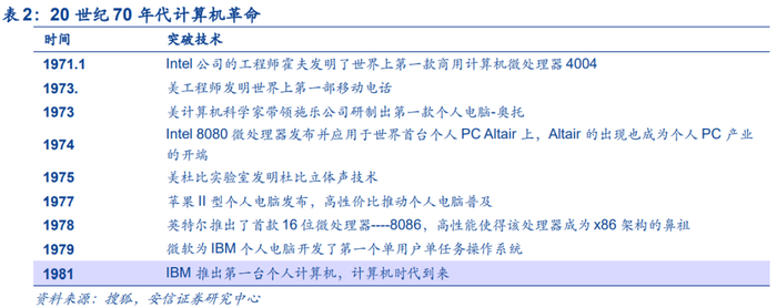1975-1983年这一阶段,市场风格的调整也主要源于新一轮科技革命的诞生。随着1974年英特尔8080微处理器发布,1971年,英特尔公司(Intel)发明了第一款商业微处理器 Intel 4004,才让小型计算机设备的出现成为可能,1976年乔布斯成立了苹果公司并设计出了第一台的民用计算机,1977年,第一台带有彩色图形的计算机 AppleⅡ推出,1977年,Intel生产出 8086 处理器,1981年,IBM 推出第一台个人计算机,个人计算机开始进入大众视野。
