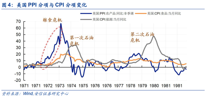 粮食危机触发 CPI 食品分项上行。1972 年世界多数国家遭受旱灾,当年 7 月苏联开始以北美为重点抢购小麦、玉米、大豆等农产品,全球粮食价格上涨,美国CPI相应上行。1972 年 7 月至 1973 年末,世界农产品价格上行了 99%,至 1974 年 11月则上行了 147%,在此期间,美国农产品PPI同比最高达66.4%,而美国食品 CPI 同比增速从 1972 年 7 月 3.7%上行至 1973 年 12 月为 20.3%,虽然1973年政府短暂宣布对部分农产品实行对外禁运,但苏联大量购入导致美国国内粮食紧缺的情况一直持续到1974年,鉴于上一次的经验,联邦政府反应较为迅速,美国粮食库存企稳,当年 6月农产品PPI同比、食品CPI同比均有所回落。