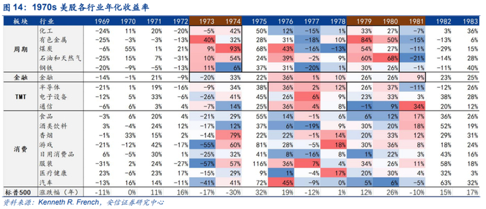 1)石油价格上涨带动了整体大宗商品价格,进而周期股普遍上涨,其收益率下跌先于大宗商价格回落;同时受利率上升影响,金融股表现尚可(74年以后),在两次滞胀期间表现滞后于周期股表现(时间维度),周期波动也显著小于周期股,相比标普500表现占优。