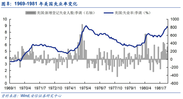 美联储一再提高通胀容忍度,滞胀再度来临。通胀容忍度提高体现在1970-1978年月平均CPI为6.63%,高于1969年5.5%的水平,美联储在对抗通胀和通胀预期时诉诸价格管制,为后续滞胀埋下伏笔。1973年三季度GDP见顶,同比增速4.77%,到1974年二季度进入衰退,GDP同比增速-0.21%,内CPI更是上升到12.3%的高点,至此美国迎来了二战后最严重的滞胀时期。由于价格过高,导致需求降低,企业大量裁员,1974年末失业率大幅上升至7.2%。货币政策此时以调节经济为主,为应对石油危机,货币政策短暂宽松,二季度至三季度,由于石油危机影响部分消退,美联储控制货币供给增速,10月后,随经济疲软,货币政策再度宽松。