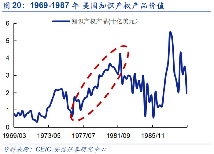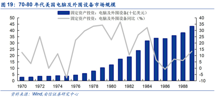 市场规模扩大,盈利占比高增。1974-1979年美国电脑及外围设备市规模由个位数进军到两位数字,随着IBM推出一台个人计算机,1981年电脑及外围设备规模达17亿美元,同比增速36%。在市场规模大幅增长的同时,计算机行业也开始盈利,1974年到1975年,软件和计算机服务行业盈利呈指数型增长,业绩涨幅由3.3%增加至34.4%,业绩的增长一方面为企业创新带来动力,企业更加注重技术研发和资本开支,可以明显看出研究和开发的增速在 1975 后始终处于高位,随后 10 年的平均增速达到 5.4%,远高于前 10 年 0.96%的平均增速,另一方面也为80、90年代的业绩爆发作铺垫。