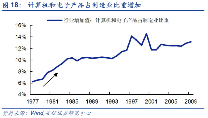 大规模集成电路应用于微处理器引爆计算机新一轮革命,计算机和电子产品产业发展迅猛。与 50、60 年代主要由 IBM 公司引领的大型计算机革命不同,70年代这一次计算机革命的最明显特征是各家第四代大规模集成电路计算机、也就是小型个人计算机的惊艳亮相。在大型计算机的时代,一台机器体积占据数个房间,价格动辄上百万美元,通常只有大型企业才会采购,并构成自动化生产线的中枢。直到1970年以后采用大规模集成电路(LSI)和超大规模集成电路(VLSI)为主要电子器件制成的计算机呼之欲出,同年IBM推出 S/370,标志着第四代大规模集成电路计算机诞生。1978年,Intel 生产出 8086 处理器,统治计算机领域的x86架构雏形初现,1981年,IBM 推出第一台个人计算机,意味着计算机时代到来。1977年至1981年,计算机和电子产品占制造业比重由6.2%增长至8.2%。