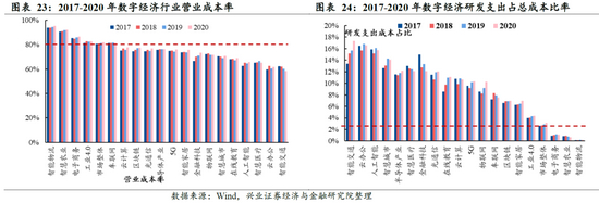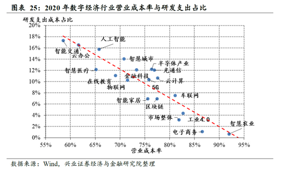 图表25展现了2020年数字经济行业营业成本率与研发支出占比之间存在明显的负相关关系,左上角的领域有更低的营业成本率和更高的研发支出占比,从而反映出成本结构中具有更高的内在优秀成长品质。其中智能交通、云办公、人工智能、智慧城市、智慧医疗、半导体、光通信、云计算等细分行业能在低成本率同时拥有更高的研发支出占比,从而具备良好的发展潜力。