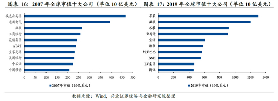 时代特征与未来趋势转变造就新型商业格局。图表16展示了金融危机前的传统商业格局,2007年全球市值前十的公司主要属于石油、金融、电信等传统行业,几乎不存在互联网的身影。到了2019年,全球市值前十的公司几乎是新兴的科技互联网公司,而且其中七大互联网公司均是平台型企业,利用规模优势、网络效应、非竞争性特点,拥有很深的护城河,时代特征与当下全球经济动能的转变形成了数字经济蓬勃发展的商业格局。