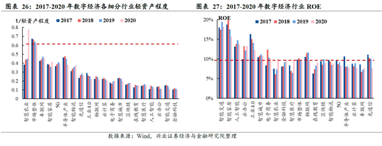 根据图表28数字经济子行业轻资产程度与ROE的比较散点图显示,智能交通、智能家居、人工智能、云办公、工业4.0等细分领域有更高的轻资产和更高的ROE,从而可能具有更加可持续的商业模式。
