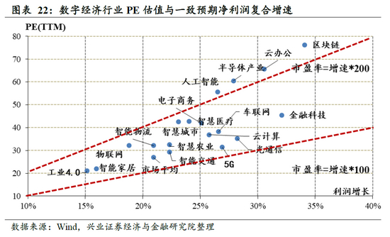 从2021-2023年Wind一致预期的收入复合增速和净利润复合增速来看,云办公、在线教育、区块链、半导体产业和人工智能保持远高于市场平均的增速,智能家居和智能物流等在两项指标上的水平较低。高估值往往蕴含着高风险,相关数字经济概念未来业绩增长能否支撑高估值水平是我们分析的重点。我们选取2021至2023三年间的Wind一致盈利预测数据进行统计分析,智能家居和智能物流等板块的净利润复合增长率低于市场19%的增长水平,车联网增长率最高为34%,在线教育、云办公、光通信、金融科技、半导体产业、智慧医疗、区块链、云计算、5G和智慧城市等行业的复合增速保持在25%左右的水平。根据以往经验,高估值需要有相对应的高增速预期支撑,虽然目前部分数字经济企业的盈利水平暂时处于低位,但科技公司较高的研发水平意味着更长远的发展,用投入的钱换取更高的回报,估值水平符合增长预期。