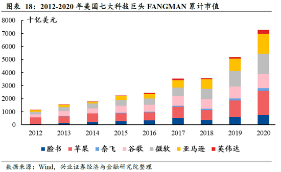 美股七大科技巨头FANGMAN的累计市值不断走高,科技企业未遇到明显的发展上限。图表18表明美国七大科技巨头FANGMAN的累计市值从2012年的1.13万亿美元增长至2020年11月的7.27万亿美元,八年时间规模增长了5倍多,全世界仅中国与美国的GDP超过这个数字,2020年日本GDP位列世界第三但也只有5万亿美元左右。技术进步是一条单行道,新技术一旦发明就不会因为不可抗力而消失,未来数字经济的科技企业仍将保持充分的增长态势。