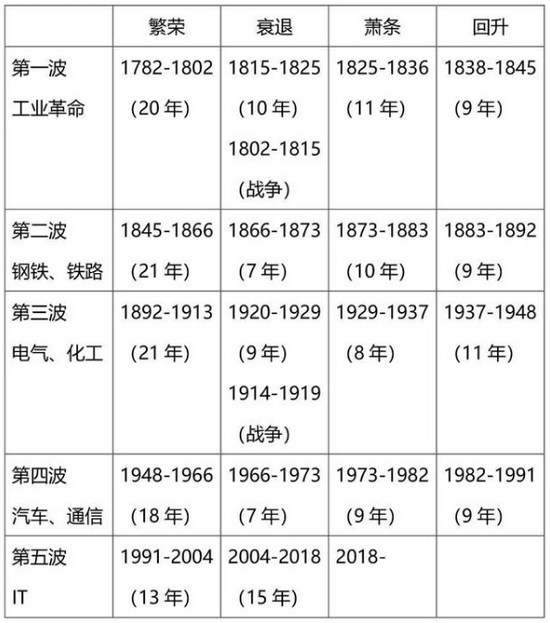 康波周期的上升部分可以分为回升和繁荣两个小部分,下降部分可以分成衰退和萧条两个小部分。下表总结了五次康波周期的情况。
