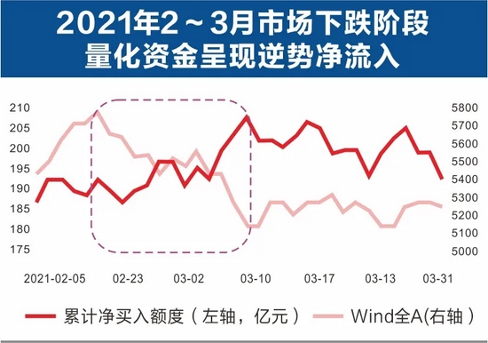 三,市场最近两年的两次大幅调整中(一次为2020年3月6日到3月24日,一次为2021年2月18日到3月9日),量化资金呈现逆势净流入。