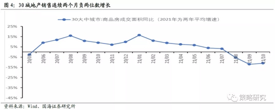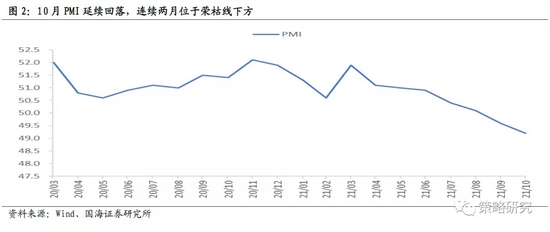 经济下行难觅拐点,地产部门是最主要的影响因素。10月PMI为49.2,较9月进一步下行,连续两月处于荣枯线下方,表明经济依然处于下行阶段,从经济的主要部门来看,存在趋势性变化的部门主要有两个,一是地产,二是出口,分别是经济的主要下拉和支撑因素。房地产方面,9月地产投资两年同比增速下行至4%,较上月下行近2个百分点,9-10月30城地产销售两年同比增速分别为-12%和-11%,连续两个月负两位数增长。从历史上来看,地产部门的下行周期共有三个阶段,分别是2007-2008年、2011-2012年和2014年,均和经济增速显著的下行区间高度重合,下行周期持续时间为一年左右,今年7月开始地产进入下行周期,目前处于下行的初期,后续对经济的负面影响将延续。出口方面,9月出口两年同比增速上行至18.4%,较上月上行1.4个百分点,从周边国家的出口来看,韩国出口两年平均增速仍维持在10%以上,发达国家PMI从高位回落的幅度较为有限。后续出口仍是经济增长的重要支点,增速是下行方向但幅度可能较为有限,核心在于三点,一是虽然海外疫情在持续好转但海外经济复苏的动力在趋弱,三季度美国经济增速低于预期,其中消费增长乏力;二是9月初开始美国新冠纾困法案结束,疫情失业补助逐渐退出;三是美国消费支出结构从商品转向服务,其中美国经济Q3服务支出仍有不错的增长,但耐用品支出显著下滑。