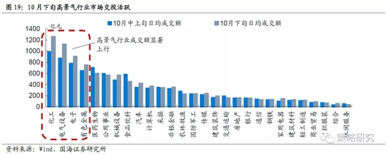 2、行业配置的主要思路:市场结构分化加大,考虑高景气抱团+超跌边际改善的配置思路。10月上市公司三季报陆续出台,市场整体业绩增速趋势性回落,全部A股当季同比增速为-0.4%,单季度首现负增长,盈利下行期确认。10月中下旬开始,高景气行业交投情绪明显升温,成长板块业绩优势凸显,随着11月总量政策空窗期到来,市场整体缺乏趋势性方向,结构分化或将加大,建议围绕高景气板块和具有防御属性的行业布局,具体包括,1)具有长期逻辑的成长板块,集中在新能源及新能源车链条,近日发布的碳中和顶层设计文件中提高了光伏建筑一体化目标,新增了2030年新能源车渗透率目标,光伏、新能源车等碳中和相关产业长期发展路径得到进一步明确和强化,把握景气确定性成为当前防御期配置的首选思路;2)前期超跌且业绩具备确定性优势的价值板块,主要集中在消费风格,其中食品饮料行业三季度业绩环比出现改善,具备估值修复动能,存在配置价值;3)景气度阶段性提升的油气产业链以及公用事业类行业,受欧洲能源危机和欧佩克拒绝加速推进增产原油的计划等影响石油价格持续上行,其中石油、天然气、油服设备等景气度持续抬升,此外,上游能源价格回落缓解电力行业成本压力,叠加水电气存在涨价预期,带来景气度阶段性提升。11月首选行业电气设备、汽车、食品饮料。