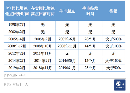 1996年之后,M1同比增速在历史出现过7次低点回升。在这7次中,存货增速同时处于高位的有5次。在符合我们判断方法的这5次中,有4次出现了牛市。