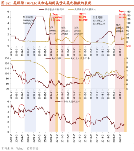 美国货币政策也可以分为数量型工具和价格型工具,美国数量型工具在2008年开始体现为美联储购买国债或者MBS等证券,被称为“QE”;价格型工具就是经典的联邦基金利率。QE和降息被认为是美联储宽松,缩减QE为政策边际收缩,加息和缩表可以看成是美联储货币政策紧缩。于是,我们可以将2003年以来划分为四种颜色。