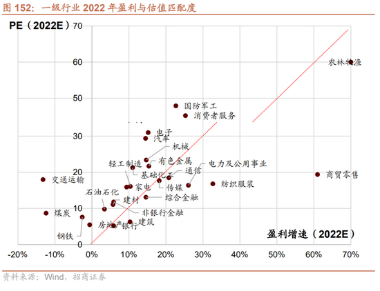 从 2022 年估值和盈利匹配度来看,PEG 围绕在 1 附近甚至明显小于 1 的行业主要集中在纺织服装、建筑、电力及公用事业、农林牧渔、银行、通信、传媒等板块。