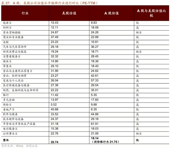 A股估值明显低于美股的行业依次为房地产、商业和专业服务、运输、零售业、食品与主要用品零售、银行、能源,主要是以传统行业为主。