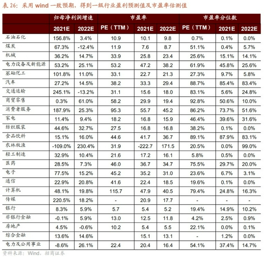 3、 一级行业:考虑盈利预期下的估值推算