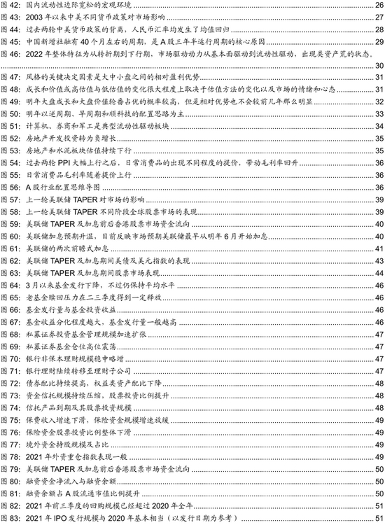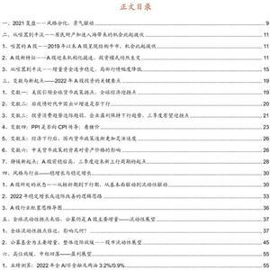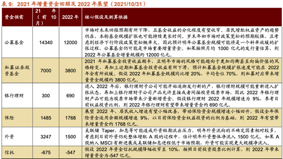 流动性展望:全球流动性拐点来临,但国内流动性走向充裕,在房住不炒深入人心背景下,公募仍是A股主要增量。我们测算A股在2022年将会有6400亿以上的净增量资金。需关注全球流动性拐点和美联储可能加息对A股的外部冲击。