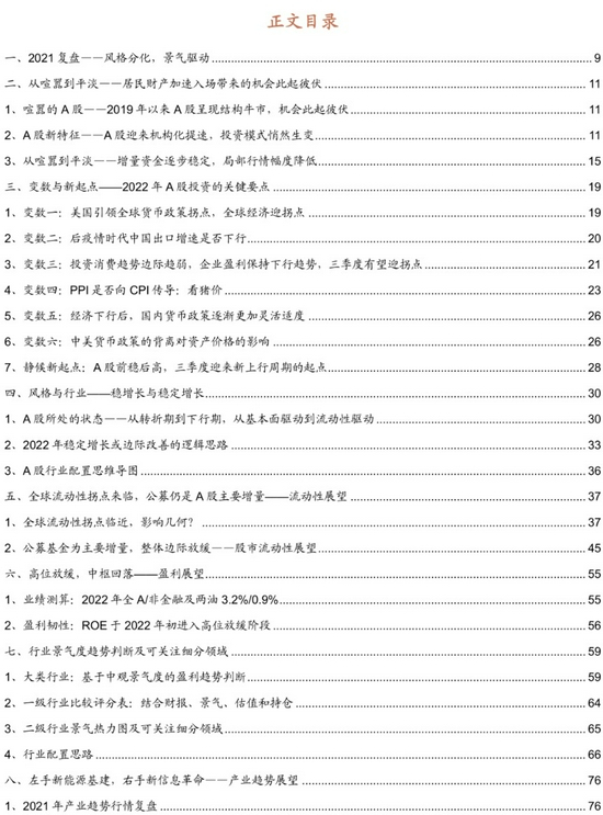 经历了大型机会此起彼伏的过去三年之后,进入到2022年,我们认为随着增量资金趋于平稳。经济整体景气度有所下行,局部板块行情的幅度将会逐渐降低,体现为从喧嚣到平淡的特征。