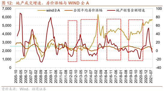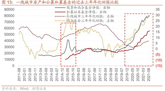 从历史数据来看。2012年之后,房地产的成交和房价的平均涨幅和A股有相对明显的反向关系,这也体现为2012年之后,能够获得10%以上年化回报的中高收益资产基本在房地产和含权基金中切换。这两类资产有一定的替代性。当房地产成交活跃、房价上行阶段,居民大量的存款甚至赎回基金卖股票转化为房地产销售;而相反当房地产成交低迷,房价上涨预期较低,投资者更容易去购买基金或股票。