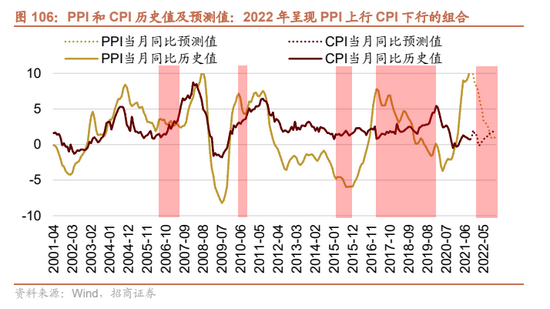 市场有观点认为,过去一年大宗商品价格大幅上行,企业的成本压力明显提升,因此将会PPI将会逐渐向CPI传导产生较为明显的通胀压力,从而制约货币政策的力度。但是我们认为,根据中国的CPI的计算方式,PPI向CPI传导的压力并不大。