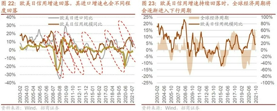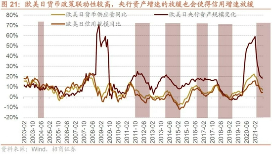 欧美日央行的货币政策联动性较高,当美联储选择逐渐收紧流动性时,日本和欧洲的央行也会相对偏紧一点,当欧美日央行总资产规模增速逐渐放缓时,欧美日总货币供应量和信用规模增速也将会同步回落。