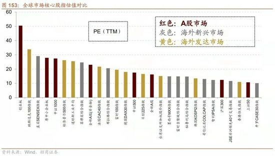 与全球股票市场核心指数估值对比,由于估值较低的金融板块占比较高,因此整体A股估值处于中等略偏低的水平,沪深300和上证50估值相对更低;剔除金融后A股估值处于中等略偏高的位置,创业板指、中证1000、中小板指估值相对更高。
