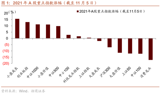 2021年A股市场整体波动加大,结构性分化加剧,截至11月5日,A股主要指数中,上证指数呈现宽幅震荡走势,小盘成长、创业板指、中证1000、中证500等指数呈现震荡上行走势,涨幅均超过10%,大盘成长、上证50、中证100、消费龙头等指数呈现震荡下行走势,跌幅均超过10%。整体而言,2021年A股市场风格分化特征明显,中小盘指数显著跑赢,主要驱动在于新能源、上游资源品板块个股上涨贯穿全年,景气分化是造成风格分化的核心因素。