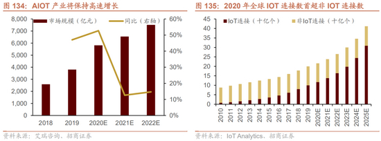 AIoT 市场规模高速增长,预计2022年可达7509亿。艾瑞咨询数据显示,2019 年中国AIoT 产业总产值为3808 亿元,预计2020 年达5815 亿元,同比增长52.7%,高增长主要得益于5G 等新技术规划化商用和AIoT 应用在消费和公共事业等领域大规模落地。根据IoT Analytics研究,2020年全球物联网连接数117亿个,首次超过非物联网连接数99亿个,物联网网络架构逐步完善、数据来源更加丰富,AIoT的发展基础日益巩固。未来三年,随着数字化基础设施进一步完善,在消费端和政策驱动端应用市场的继续推动下,AIoT 产业将保持高速增长。