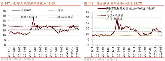 根据前文对于A股盈利预期并采用自下而上的方法来推算未来估值的变化情况,全部A股2021年/2022年净利润增速测算值分别为28.9%/3.2%,2022年盈利增速对应的市盈率水平为10.7倍;非金融及两油2021年/2022年净利润增速测算值分别为45.1%/0.9%,2022年盈利增速对应的市盈率水平为16.9倍。考虑到2021年及2022年盈利增长之后,当前A股估值水平处于相对合理位置甚至偏低的水平。