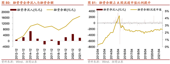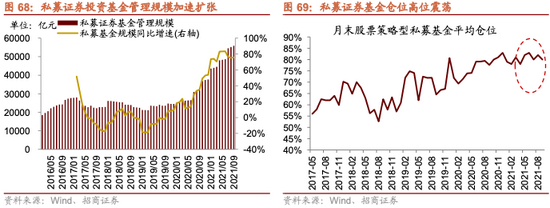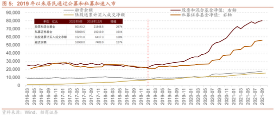 2019年以来,居民通过公募和私募加速入市,截止2019年9月,股票型和混合型公募规模达到超过8万亿,较2018年12月底增加267%,这其中有净值上涨的贡献,但是从份额增长情况来看,股票型和混合型公募的份额从2018年年底的2.1万亿份增长至2021年9月底的5.3万亿份,居民资金的流入是规模增长的主要原因。而私募基金的规模从2018年底的1.9万亿元增长至2021年9月的5.6万亿元,增幅达到191%。