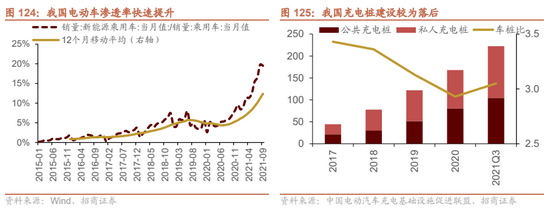 电动车进入爆发期,充电桩建设明显落后。今年以来,我国新能源车的渗透率不断提升,从去年底的约5%提升至截止今年9月约12%。与此同时,欧洲电动车的渗透率也提升较快,美国有望在政策推动下接力。尽管电动车保有量的不断增长,充电桩的建设却较为缓慢,截止2020年底,我国车桩比仅为3:1。