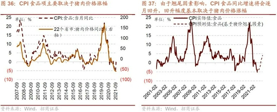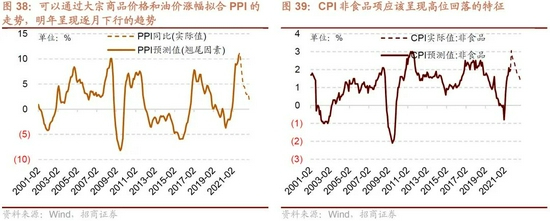 CPI的结构中食品类占比约为30%,非食品类的占比约为70%,在实际的贡献测算过程当中,最新数据显示食品CPI对CPI的贡献约为20%左右,非食品CPI贡献约为75%左右,因此对于CPI贡献更大的仍然是非食品CPI,而从图中可以看出非食品CPI与PPI基本同步反映了经济总体需求的情况,而非滞后于PPI,因此若明年在高基数的背景之下,大宗商品价格回落拉动PPI增速回落则非食品CPI增速难以进一步回升,甚至可能会保持回落的趋势。