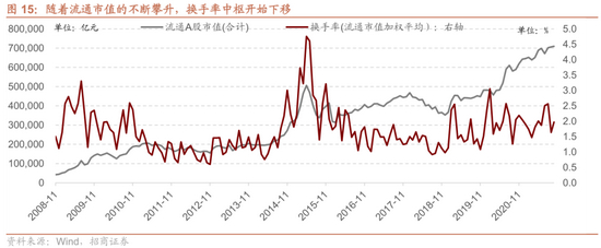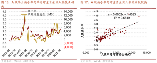 换手率的提升离不开增量资金,数据显示,A股的单月换手率与单月增量资金的流入高度正相关。2019年4月、2020年2月、2020年7月和2021年1月市场脉冲式的上涨,我们观察到的就是换手率明显提升,同时伴随着增量资金明显提升,当然反过来市场活跃度和明显的上涨又会吸引更多的资金流入,形成正反馈。