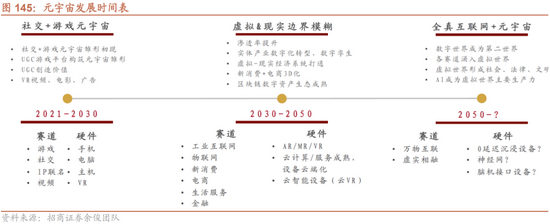 技术供给层面,元宇宙相关技术的发展已经到规模化应用的临界点。根据《2020-2021元宇宙发展研究报告》,技术的发展与应用规模化普及被视为“元宇宙”得以推进的关键。十余年来,AI、VR、AR、5G、大数据、数字孪生、云计算、区块链等技术长足发展,但尚未出现结合这些技术的消费级产品理念,“元宇宙”则是对系统新型技术的统摄性产品化想象,可统合诸多新兴技术,将其导向可落地的产品形态。应用生态日益完善,在元宇宙发展的基础阶段,应用将主要集中于游戏、短视频等社交场景。发展至延伸应用阶段,将逐步向教育、医疗、建筑设计等场景拓展。进一步发展至应用生态阶段时,全景社交将成为虚拟现实终极应用形态之一