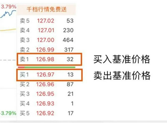 买入的基准价格是即时揭示的最低卖出申报价格,对应五档行情中的卖一价格;如果没有“卖一”,买入基准价格则为“买一;若无“买一”,买入基准价格则为最新成交价;当日无成交的,买入基准价格为前收盘价。