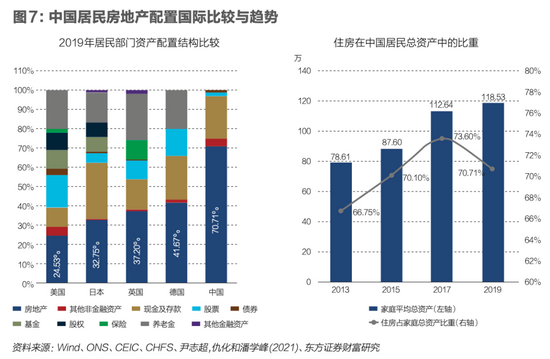 从2019年国外居民部门房地产配置结构来看,日本居民配置房地产的比重约在32%,美国的比重约为24%,德国为41%,英国为37%左右,中国的地产配置明显偏高,以房地产配置比重由70.71%降至50%为标准进行估算,普通中国家庭总资产中的20%,约23.7万元需要从房地产市场中剥离进行再配置。2020年中国第七次人口普查数据显示,中国共有家庭49416万户,加总至宏观层面,意味着全国当下共有约117.12万亿元的资产在未来十年内需进行再配置,否则将可能面临资产消融的可能。