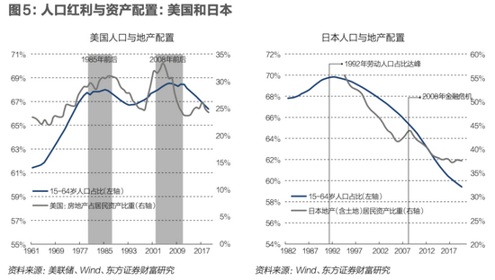 从生命周期的角度看,典型的个体追求的是其生命周期内一生效用的最大化(Modigliani和Brumberg,1954)。由于收入与消费的不匹配,个人一生在不同阶段倾向于配置不同类型和风险特征的资产,并调整风险资产的配置比重。从微观视角看,劳动年龄阶段的人口住房配置需求处于一生中的最高峰。反映到宏观层面,则意味着房地产配置比重也会与人口结构呈现正相关性。社会劳动人口比重上涨,进入住房市场的人口增速远远超过65岁以上人群离开住房市场的速度,需求流入量大于流出量,推动地产配置比重上涨。反过来,当老龄化程度上升,劳动年龄人口比重下降,房地产市场中流出的人口大于流入的人口,表现为地产配置比重的回落。