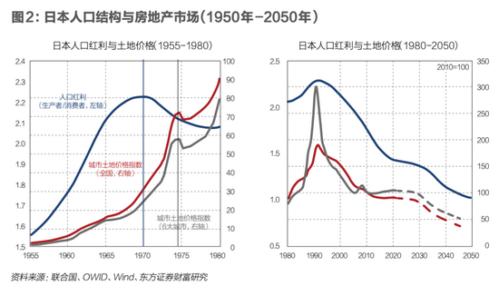 日本。日本地产随着人口结构的变化,出现了较为典型的两轮上涨和下行周期。日本地产价格的上涨期分别出现在20世纪60年代至70年代初以及80年代,共性是生产者对消费者比值上升,劳动力充足,投资上涨,经济高速增长。1955年至1970年,日本年均GDP增速达到9.6%,80年代更是日本的黄金十年,居民地产直接配置需求与经济上升预期的螺旋共振,对房价形成了极高的支撑力量。