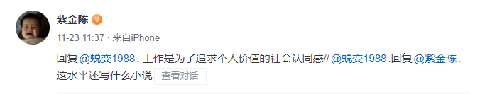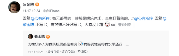 在晒出上述股票收益后,网友评论,“这水平还写什么小说”,紫金陈回复:“工作是为了追求个人价值的社会认同感”。