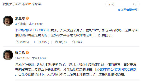 化工股方面,紫金陈近期多次表示加仓了中国石化。“4块1以下我每天加仓,毕竟这票的极限低位比现价也就亏10%,股息率比我银行里放着2.7%高多了,股价爆发一下还有意外惊喜。业务也不像其他银地保之类的看不透 ,每年高分红,不会乱融资,简直是闲置资金的配置万金油选择。”他说。