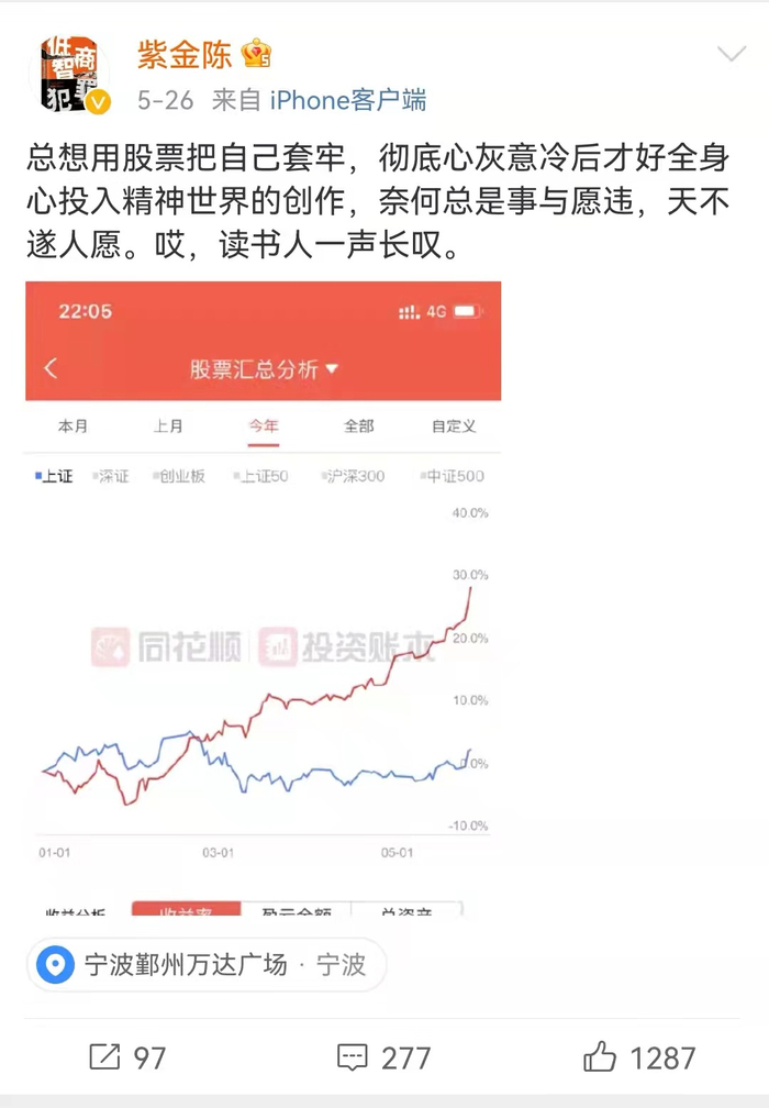 年化收益80%,顶流悬疑小说家紫金陈晒收益,击败96%股民,网友:是被写书耽误的股神